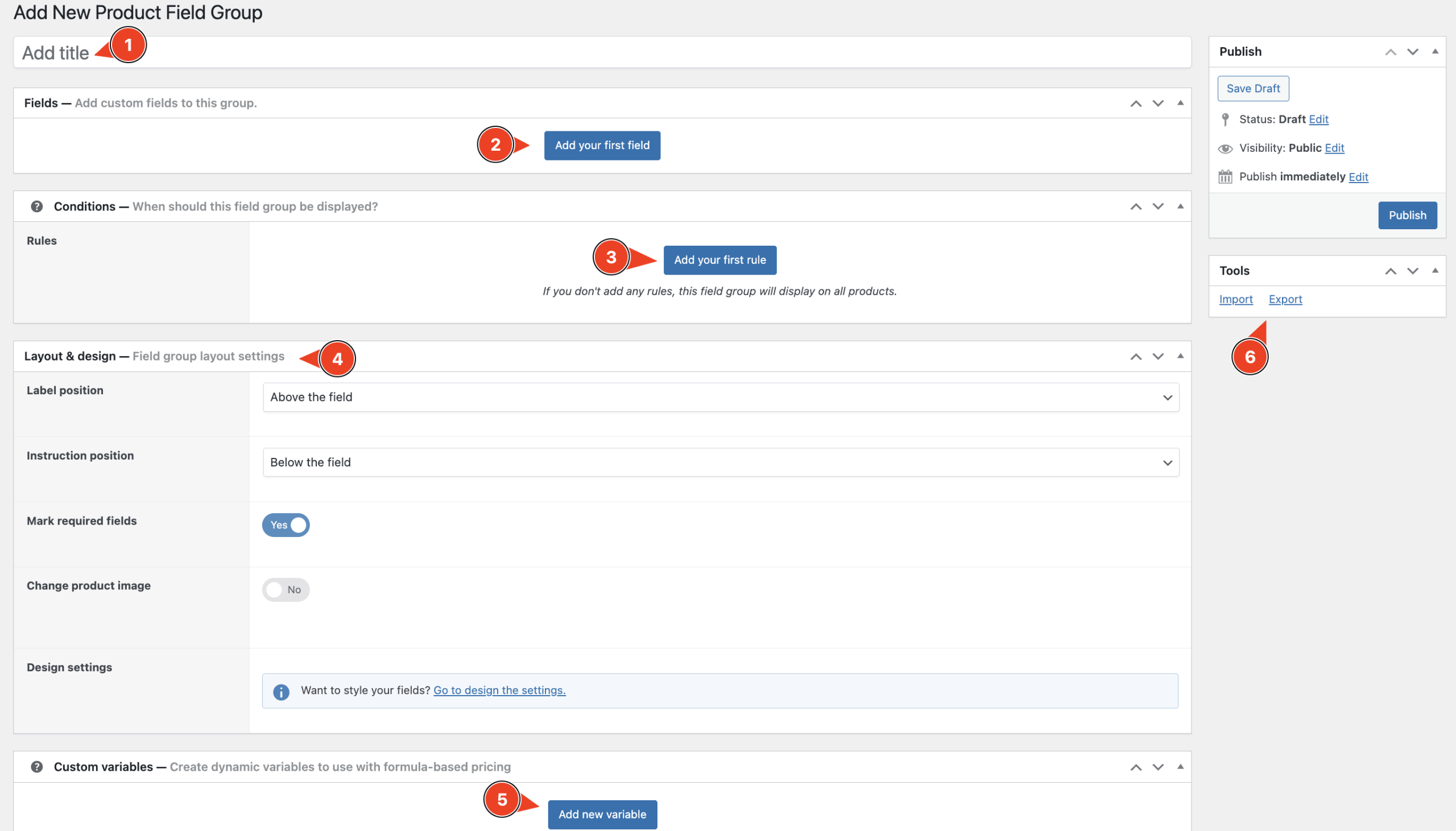 Via the WordPress admin menu, go to WooCommerce → Product Fields and click Add New. You’ve now created an empty field group. Below, we’ll go over each section of the Field Group screen, so you know what you’re looking at.