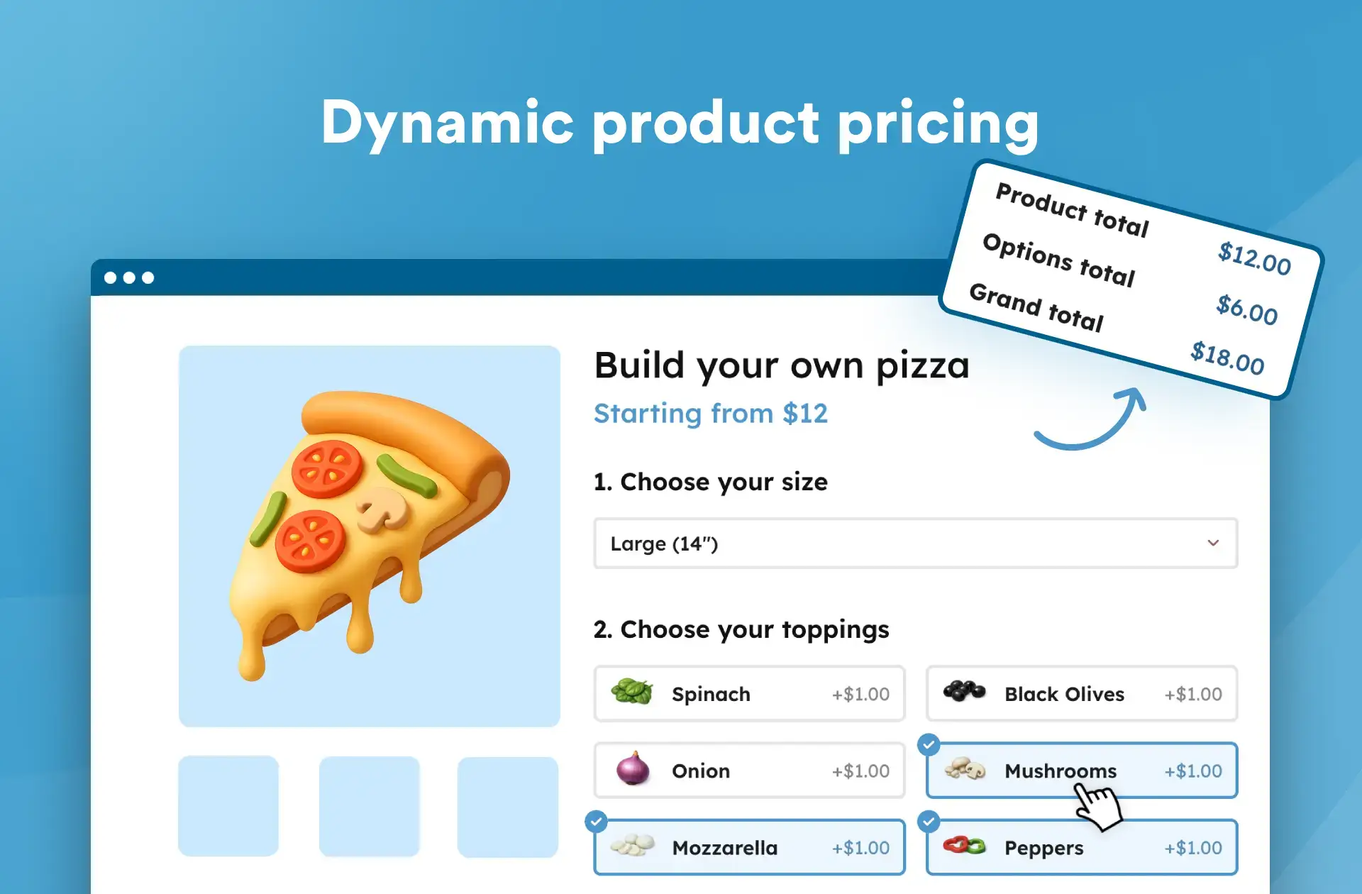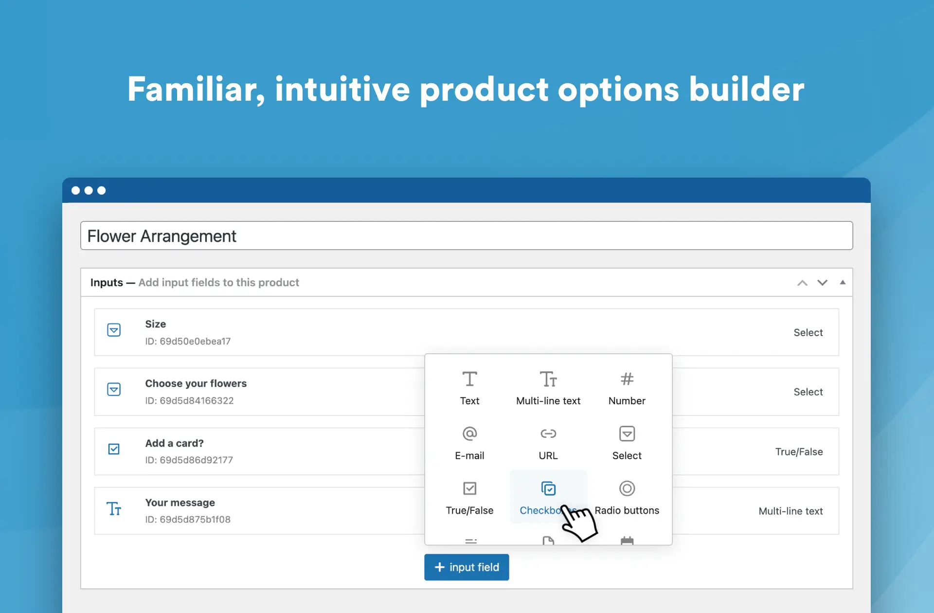 You can choose between 18 different input types to add to your products, including: text boxes, number fields, dropdown lists, checkboxes, radio buttons, image swatches, color swatches, date fields, and file upload.